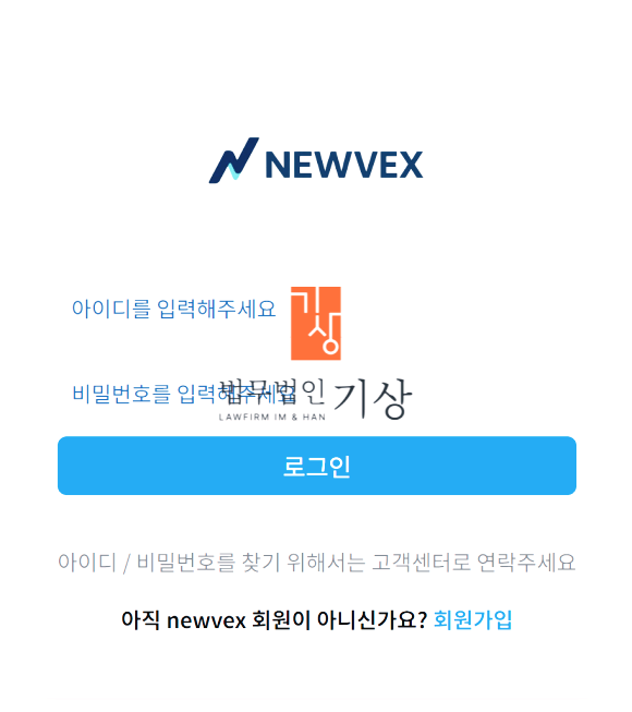 리딩방 안내에 따라 newvextrade.com에 접속해 NEWVEX 주식 앱 로그인 화면을 확인했습니다. 아이디와 비밀번호 입력 방식이었고, 고객센터를 통한 계정 관리가 강조됐습니다. 피해자는 “실제 거래소 로그인 화면처럼 보였습니다”, “외부 접근이 어렵다고 해서 더 믿게 됐습니다”라고 했습니다.