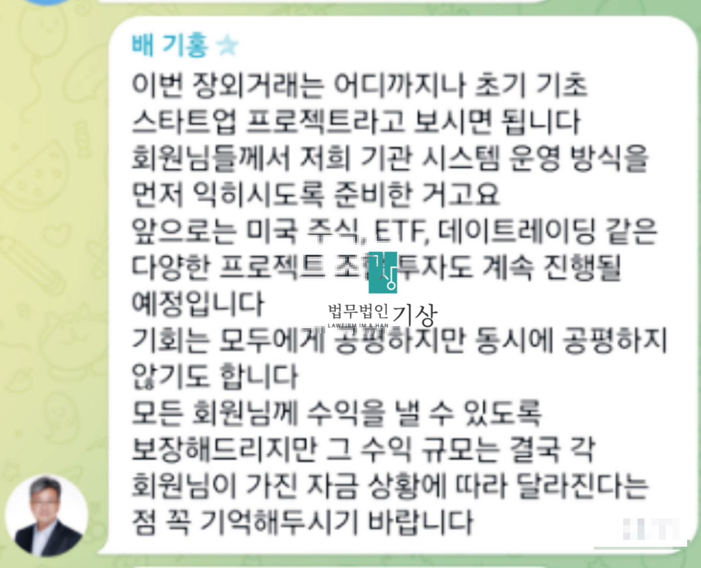 텔레그램 단체방 ‘자본시장연구 클럽'에서는 배기홍 교수 이름과 사진을 사용하는 계정이 중심 역할을 했습니다. 그는 개인투자자의 심리, 고점 매수의 위험성, 공포 구간에서의 대응 등을 설명하며 신뢰를 쌓았습니다. 장문의 메시지는 실제 강의처럼 구성되어 있었고, 참여자들은 “교수님이 다시 설명해 주신다”, “오늘 강의 기대된다”는 반응을 보였습니다. 피해자는 이러한 분위기 속에서 해당 인물이 실제 전문가라고 믿게 되었다고 했습니다.