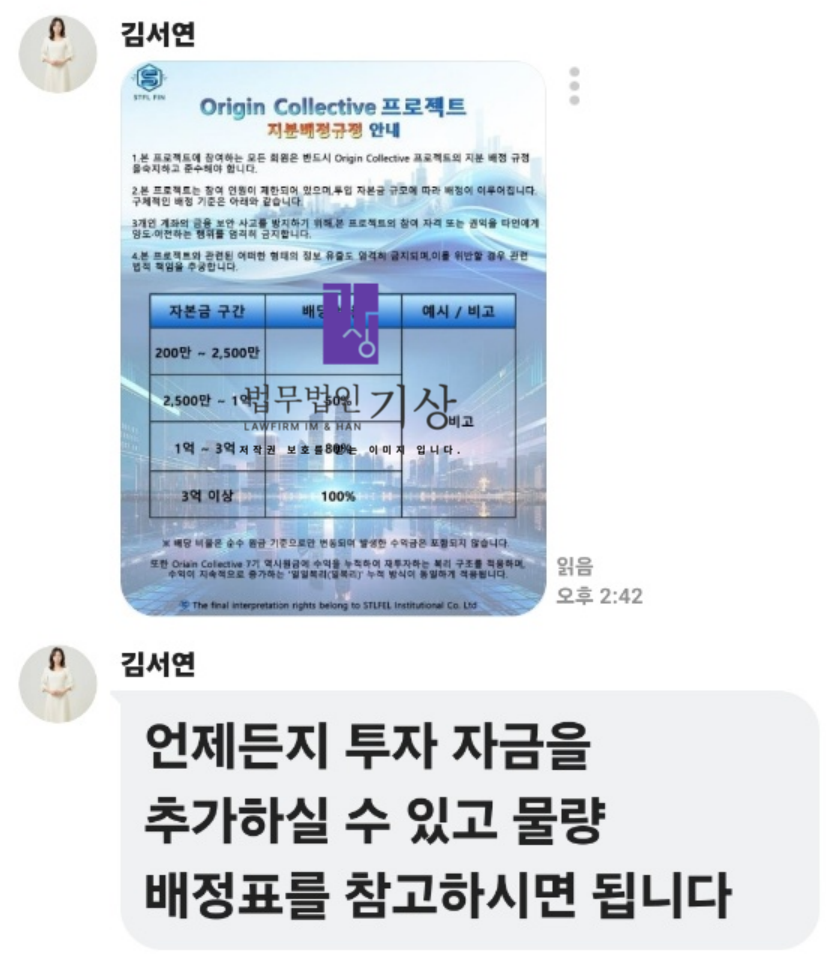 문제는 그 다음 단계에서 발생했습니다. 앱 화면에는 실제 투자 규모와 전혀 맞지 않게 4000주 이상이 배당되었다는 메시지가 나타났고, 배정 금액이 4000만 원 이상으로 표시되었습니다. 곧바로 고객센터를 사칭한 채널에서 연락이 왔고, “배당 주식 금액을 입금해야 출금이 가능하다”, *“지금 입금하지 않으면 기존 계좌에 있는 돈도 돌려줄 수 없다”*는 식의 압박이 이어졌습니다. 이 과정에서 STFL MK 사기 앱과 오리진 컬렉티브 프로젝트7기 명칭은 반복적으로 사용되었습니다.