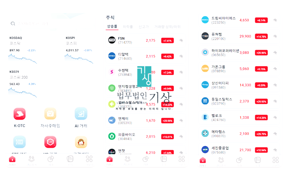 EFG Lab 앱은 실제 증권사 모바일 거래 시스템과 매우 유사한 화면 구성을 갖고 있었습니다. 지수 표시, 상승 종목 정렬, 관심종목 관리 기능이 구현되어 있었고, 특히 K-OTC 거래가 가능한 것처럼 표현된 메뉴가 투자자의 관심을 끌었습니다. 이 과정에서 특정 종목의 수익률이 반복적으로 강조되며 추가 자금 투입이 자연스럽게 이어졌습니다.